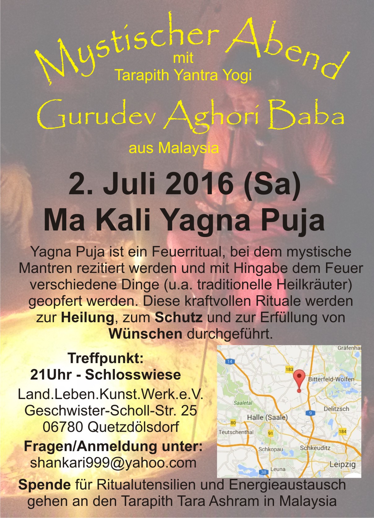 Zu einem Feuerritual lädt Tarapith Yanga Yogi Gudruev Aghori Baba aus Malaysia am 02.07. ab 21.00 Uhr auf der Schloßwiese ein. |
